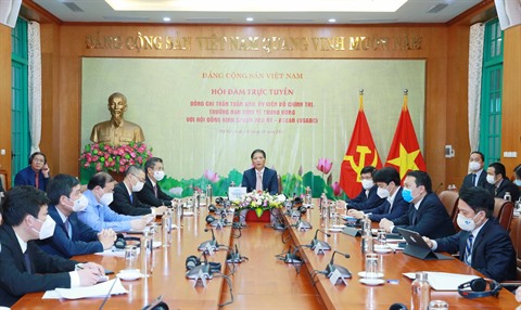 | Le chef de la Commission économique centrale du Parti, Trân Tuân Anh (centre), à la séance de travail en ligne avec une délégation du Conseil d’affaires États-Unis - ASEAN (USABC). |