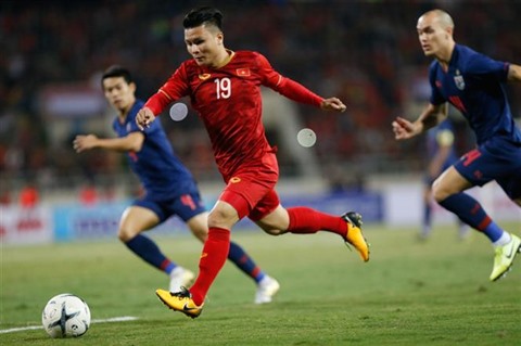| Le milieu du terrain Nguyên Quang Hai (centre) lors du match contre la Thaïlande, le 19 novembre à Hanoï. |