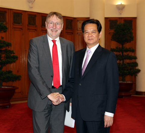 | Le Premier ministre Nguyên Tân Dung (droite) et le président de la Commission du commerce international du Parlement européen, Bernd Lange, le 7 avril à Hanoi. |