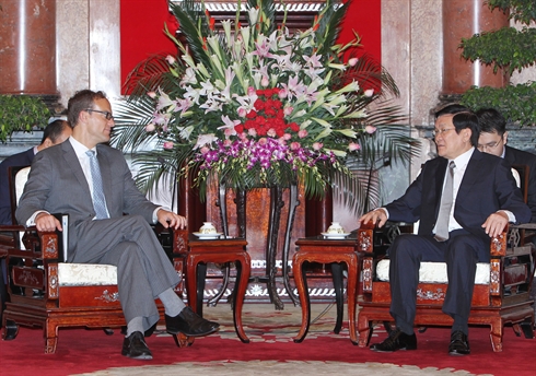 | Le président du Vietnam, Truong Tân Sang (droite), a reçu le 23 avril à Hanoi l'ambassadeur Demetrios James Marantis, représentant p.i. au commerce des États-Unis. |