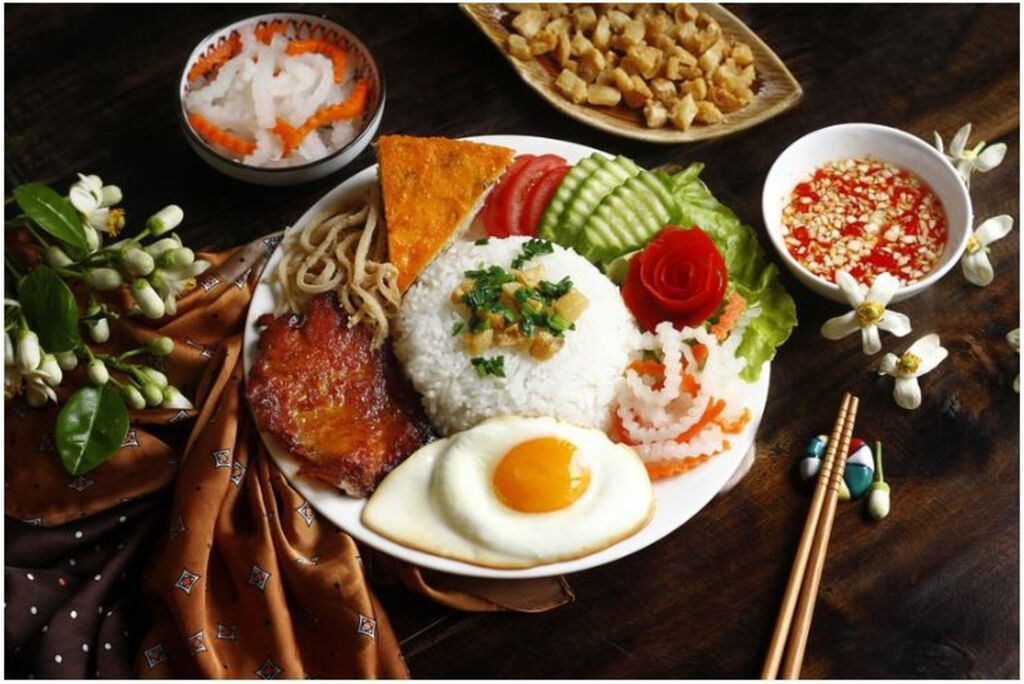 | Le Com Tâm est un plat populaire du Sud à base de brisures de riz, servi en général avec du porc grillé et de la sauce de poisson aigre-douce. |