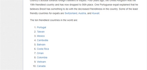 Le sondage “Friendliest Countries 2021” concerne 180 pays et territoires. Le Vietnam se classe 9e. Selon le classement 2021, le Portugal est le pays le plus sympathique et le plus accueillant au monde pour les expatriés.Les dix pays les plus amicaux ont des taux de 81% à 94% pour les attitudes amicales envers les résidents étrangers. Ceux-ci sont bien au-dessus du taux moyen mondial de 67%.