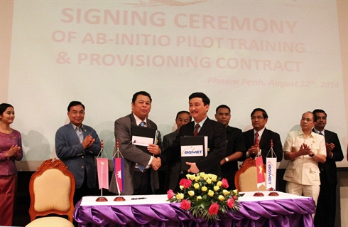 | Cérémonie de signature de formation des pilotes de niveau élémentaire de la Compagnie aérienne nationale du Cambodge et la Compagnie par actions de formation de pilotes Bay Viêt, le 12 août à Phnom Penh. |