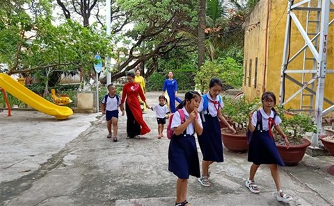 | Des élèves de l'école primaire Sinh Tôn, archipel de Truong Sa, lors de la rentrée scolaire 2022-2023. |