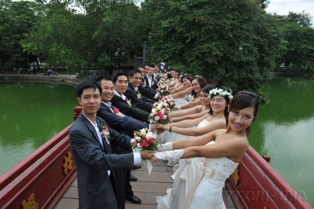 | Une cérémonie de mariage collective au lac Hoàn Kiêm (Hanoï). |