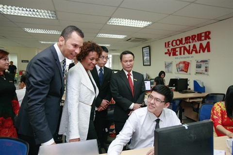 | La secrétaire générale de la Francophonie, Michaëlle Jean, au siège du Courrier du Vietnam, à Hanoï. |