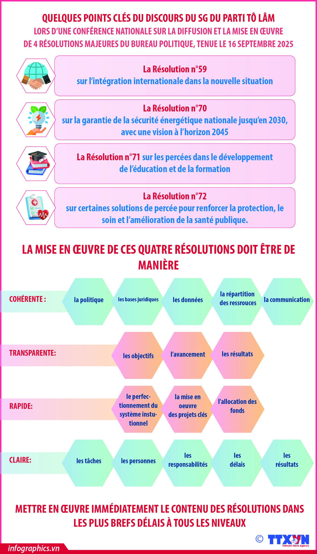 S’inspirant fidèlement de l’esprit du XIVe Congrès national du Parti, axé sur "l’autonomie stratégique, l’indépendance, la confiance et un essor résolu de la nation", le travail diplomatique et d’intégration internationale doit répondre aux exigences d’une innovation et d’une percée majeures dans la pensée et l’action, promouvoir son rôle pionnier et son esprit d’innovation, en collaboration avec les piliers de la défense et de la sécurité, et accomplir sa mission essentielle et permanente : faire progresser la diplomatie dans cette nouvelle ère, à la hauteur du prestige historique et culturel et de la nouvelle position et force du pays, et promouvoir la mise en œuvre d’une politique étrangère globale à un niveau supérieur, contribuant ainsi à l’économie, à la politique et à la civilisation mondiales.