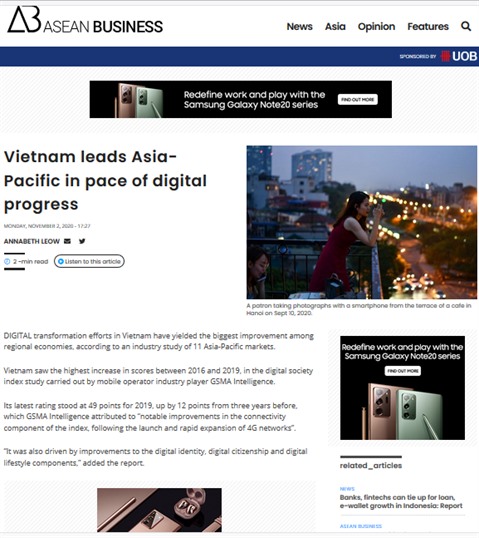 | Capture d'écran de l'article de Business Times sur les progrès numériques du Vietnam. |