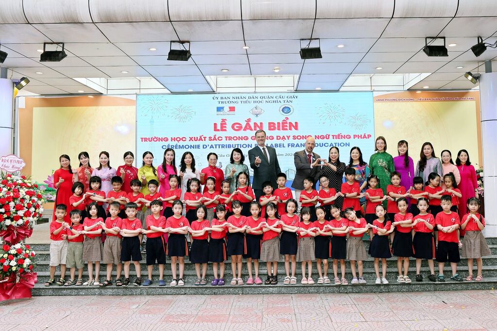 | L’ambassadeur de France au Vietnam, Olivier Brochet, assiste à la cérémonie de remise du LabelFrancÉducation (une marque d’excellence décernée aux meilleurs établissements bilingues pour la qualité de leur enseignement du français), à l’école primaire Nghia Tân, le 29 mai, et au collège Giang Vo, le 18 septembre à Hanoï. |