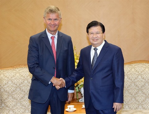 | Le vice-Premier ministre vietnamien Trinh Dinh Dung (droite) et le directeur exécutif du PNUE, Erik Solheim, le 7 août à Hanoï. |