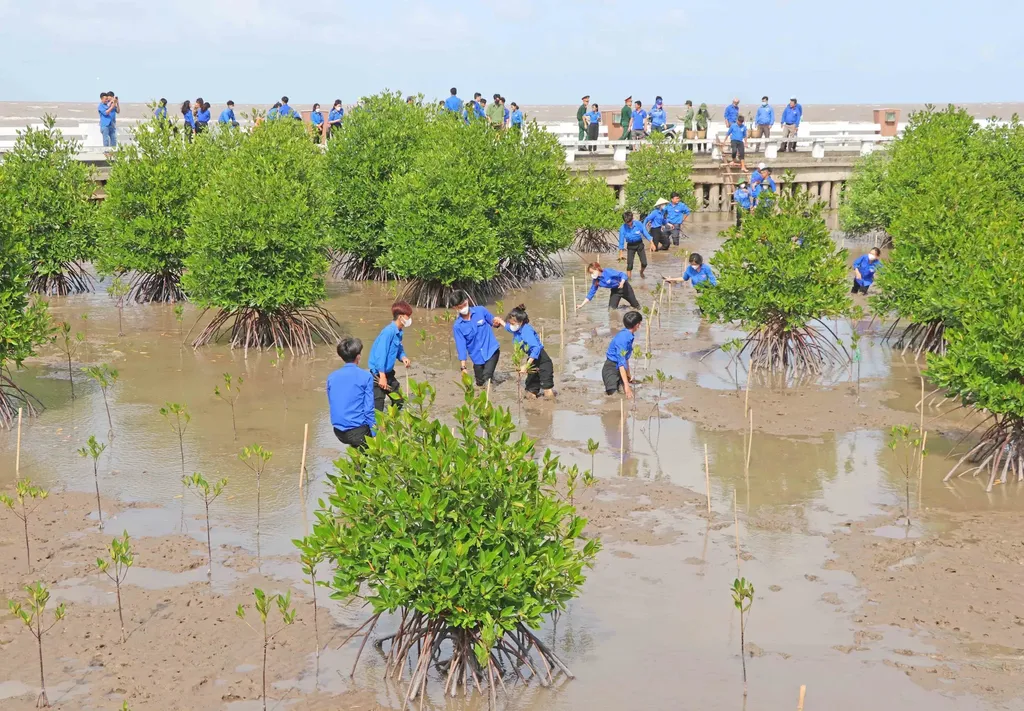 | Un millier de jeunes et membres de l’Union de la jeunesse communiste Hô Chi Minh à Cà Mau participent à la plantation de forêts dans le parc national du Cap de Cà Mau dans le cadre de la campagne des jeunes bénévoles de l’été 2023. |