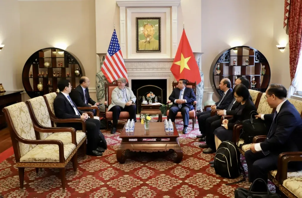 | Lors de la rencontre entre le ministre du Plan et de l'Investissement, Nguyên Chi Dung (au centre, à droite), et le Dr. Richard Lawton Thurston. |