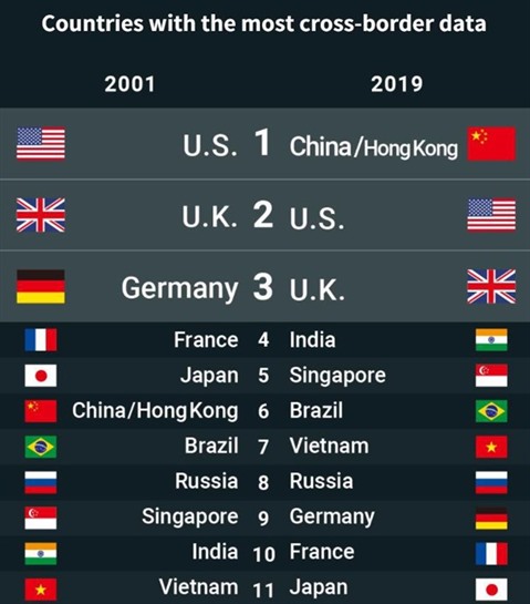 | Le classement des pays ayant la plus grande quantité de données transfrontalières transférées. |