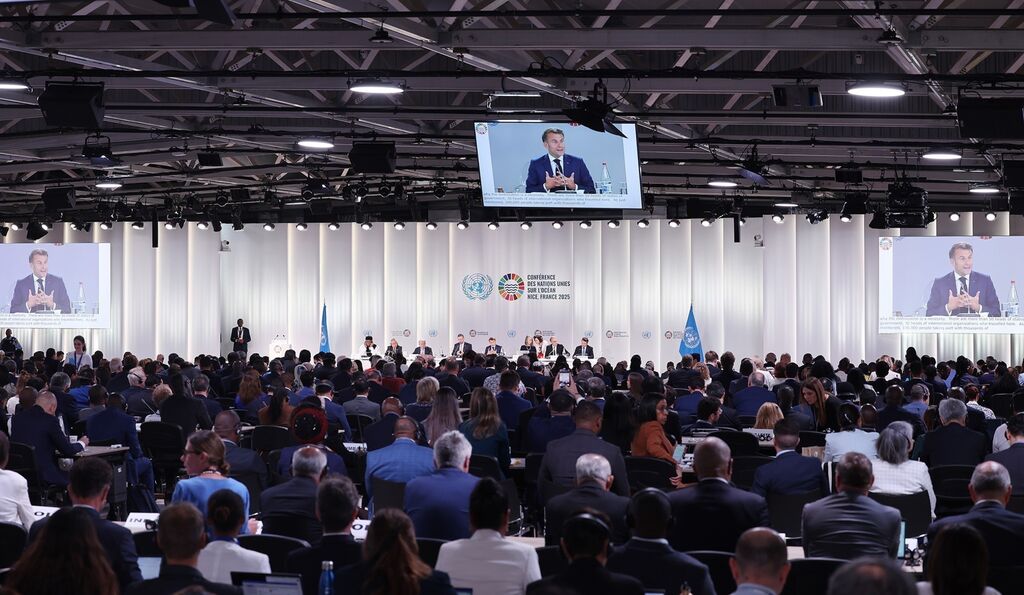 | Le président français Emmanuel Macron prend la parole lors de la séance d’ouverture de la 3ᵉ Conférence des Nations unies sur l’océan (UNOC 3). |