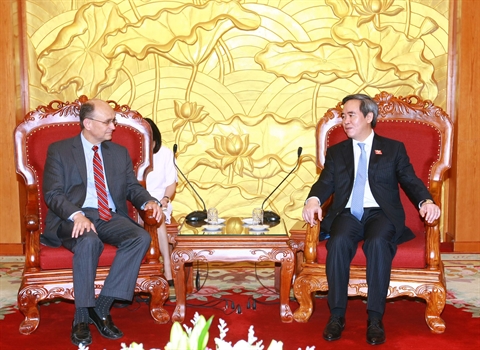 | Le président de la Commission centrale de l’économie du PCV, Nguyên Van Binh (droite), reçoit le sous-secrétaire au Trésor américain chargé des affaires internationales, Nathan Sheets. |