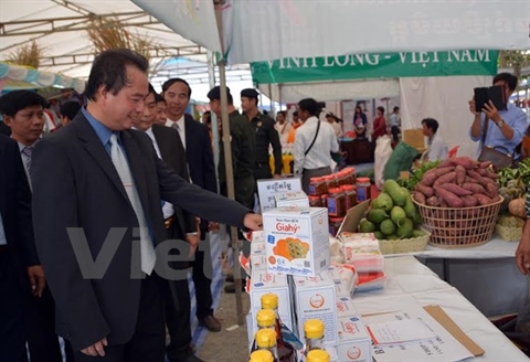 | Chhuon Dara (1er plan, à gauche), secrétaire d'État cambodgien au Commerce, visite le stand de marchandises de la province de Vinh Long. |