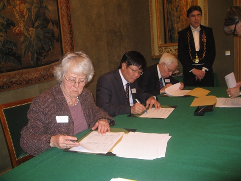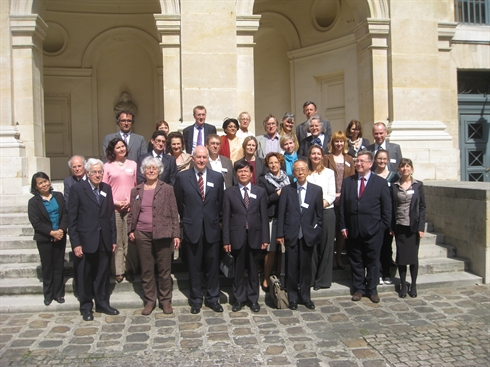 | Le vice-président de l'ASSV, Nguyên Quang Thuân (2e à gauche), lors de la cérémonie de signature de la Charte de fondation du Groupe d'intérêt public de l'ECAF, le 3 juin à Paris |