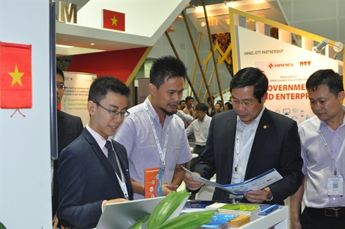 Les participants vietnamiens - en provenance de VietnamPlus de l’Agence Vietnamienne d’Information (VNA), de la Voix du Vietnam (VOV), du Groupe des postes et des télécommunications du Vietnam (VNPT), du Groupe des technologies de l'information du Vietnam (FPT), de la Compagnie générale de multimédia du Vietnam (VTC), de l’Eurl de téléphonie mobile VMS (MobiFone) et de l’Eurl Hanel - présentent leurs produits et services, ainsi que vulgarisent les politiques du Vietnam sur la communication et les TI.