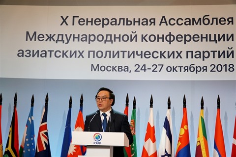 | Le chef de la Commission des relations extérieures du Comité central du PCV, Hoàng Binh Quân, lors de la 10e conférence internationale des Partis politiques d’Asie à Moscou, |