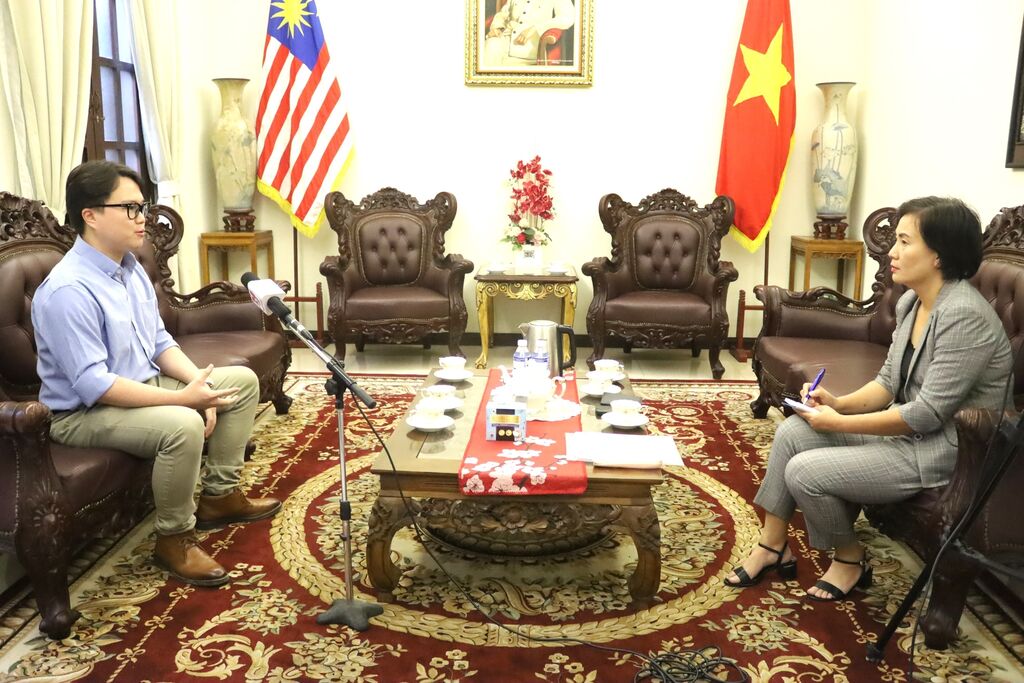 | Enzo Sim Hong Jun, chercheur en histoire à l'Institut de recherche de Penang (gauche) lors d'une rencontre avec une correspondante de la VNA à Kuala Lumpur. |