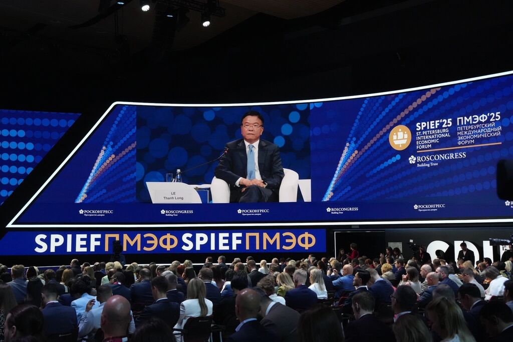 | Le vice-Premier ministre Lê Thành Long s'exprime lors de la séance d'ouverture du 28e Forum économique international de Saint-Pétersbourg. |