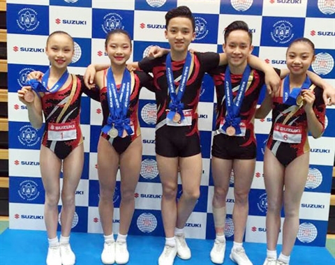| Les sportifs vietnamiens brillants lors de la Coupe du monde de gymnastique aérobic Suzuki 2015. |
