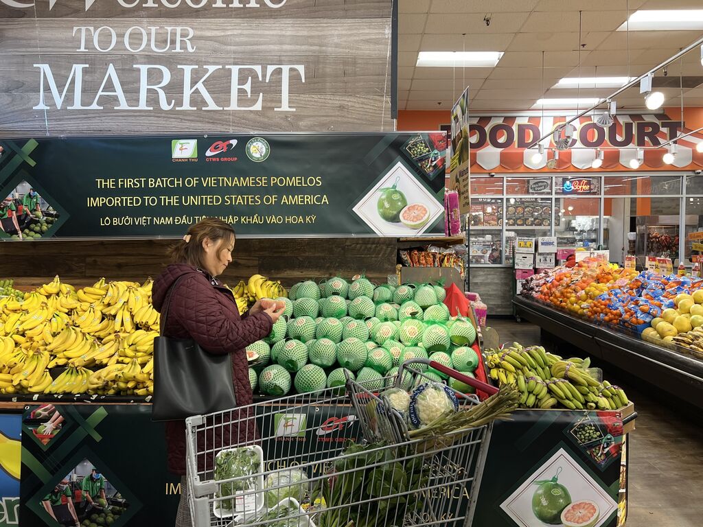 | Le pomelo à peau verte de Bên Tre du Vietnam dans un supermarché aux États-Unis. |