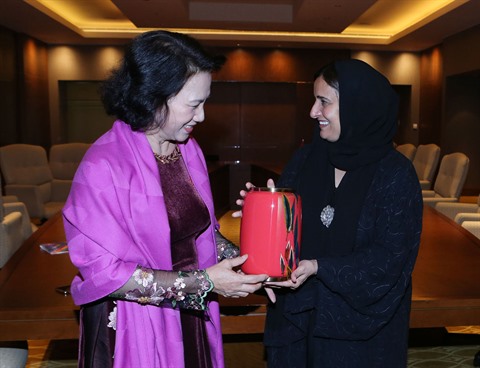 | Nguyên Thi Kim Ngân (gauche) offre un cadeau à Sheikha Lubna Khalid Al-Qasimi, le 12 décembre à Abu Dhabi. |