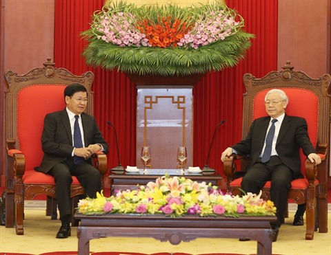 | Le secrétaire général du Comité central du Parti communiste du Vietnam, Nguyên Phu Trong (droite), et le Premier ministre laotien Thongloun Sisoulith. |