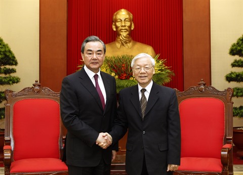 | Le secrétaire général du PCV, Nguyên Phu Trong (droite), et le conseiller d’État et ministre chinois des Affaires étrangères, Wang Yi. |