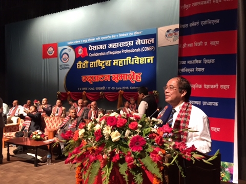 | Nguyên Van Ngàng, vice-président de la CGTV, prend la parole lors du 16e congrès de la Confédération des professionnels népalais (CONEP), tenue du 17 au 19 juin au Népal. |