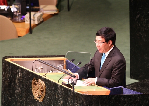 | Le vice-Premier ministre et ministre des Affaires étrangères Pham Binh Minh prononce un discours lors du Sommet de l'ONU sur le climat, le 23 septembre à New York. |