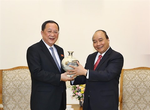 | Le Premier ministre vietnamien Nguyên Xuân Phuc (droite) reçoit un cadeau offert par le ministre nord-coréen des Affaires étrangères Ri Yong-ho. |