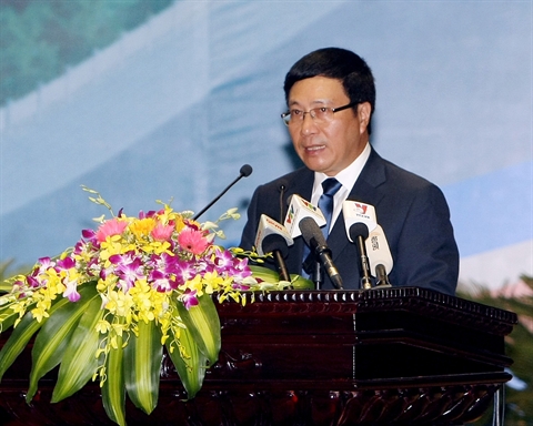| Le vice-Premier ministre et ministre des Affaires étrangères Pham Binh Minh, lors de la conférence du 23 mai à Hanoi. |