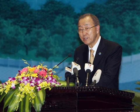 | Le secrétaire général de l’ONU, Ban Ki-moon, à la conférence du 23 mai à Hanoi. |