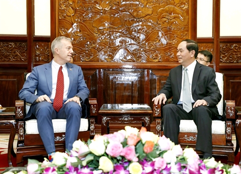 | Le président vietnamien Trân Dai Quang (droite) a reçu vendredi 31 mars à Hanoi l’ambassadeur des États-Unis au Vietnam, Ted Osius. |