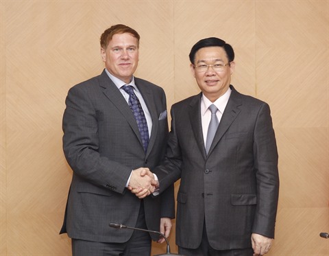 | Le président de l'AmCham, Michael Kelly (gauche), reçu par le vice-Premier ministre vietnamien Vuong Dinh Huê, le 2 mai à Hanoï. |