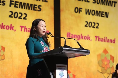 | La vice-présidente Vo Thi Anh Xuân prend la parole lors du Sommet mondial des femmes 2022, le 23 juin à Bangkok. |