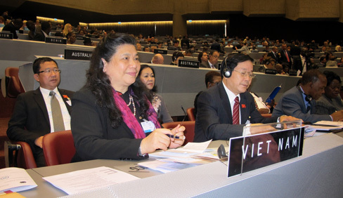 | La délégation du Vietnam à la 131e Assemblée générale de l'Union interparlementaire (IPU-131), à Genève, en Suisse. |