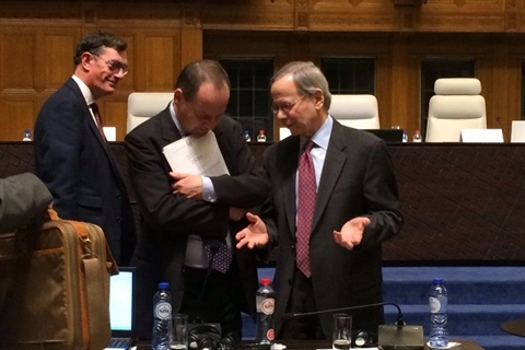| Professeur Philippe Sands (centre) et Paul Reichler (droite), avocats des Philippines. |