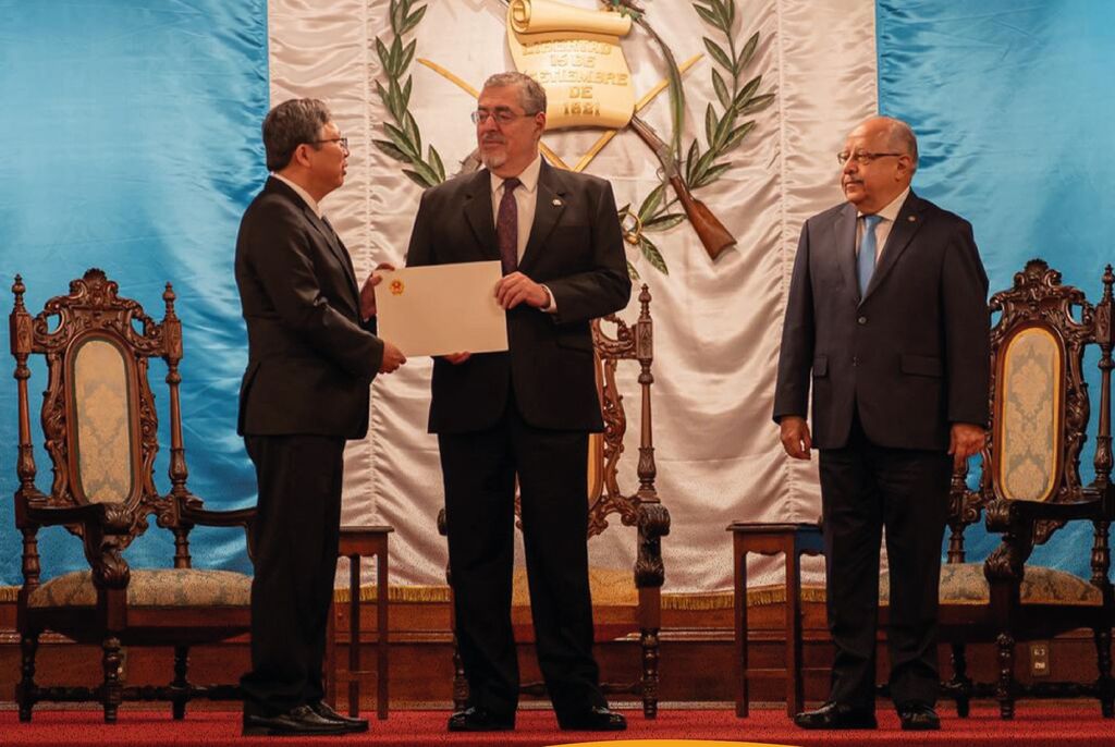 | L’ambassadeur du Vietnam au Mexique, accrédité concurremment au Guatemala, Nguyên Van Hai (gauche), présente les lettres de créance du président vietnamien Luong Cuong au président guatémaltèque Bernardo Arévalo, le 16 janvier (heure locale). |