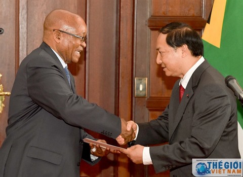 | Le nouvel ambassadeur du Vietnam en République d’Afrique du Sud, Vu Van Dung (droite), présente ses lettres de créance au président sud-africain Jacob Zuma. |