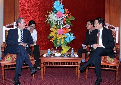 | Le président Truong Tân Sang (droite) et le représentant au commerce des États-Unis, B.G. Froman, à Hanoi. |