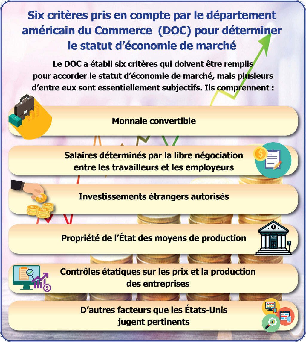 D’après Murray Hiebert, expert du Centre d’études stratégiques et internationales (CSIS) à Washington D.C, il est incompréhensible que les États-Unis plaçent le Vietnam aux côtés de 11 autres pays en tant qu’économies non marchandes, alors qu’ils sont un partenaire stratégique global du Vietnam. “Les États-Unis devraient accorder au Vietnam le statut d’économie de marché, surtout après que les deux pays se sont mis d’accord lors de la visite de Biden en septembre dernier pour établir un partenariat stratégique global”, a-t-il affirmé. Il s’est empressé d’ajouter que maintenir le statut d’économie non marchande au Vietnam est “arbitraire”, contre-productif et ne constitue pas une manière de traiter “l’un des partenaires les plus proches de Washington en Asie du Sud-Est”.