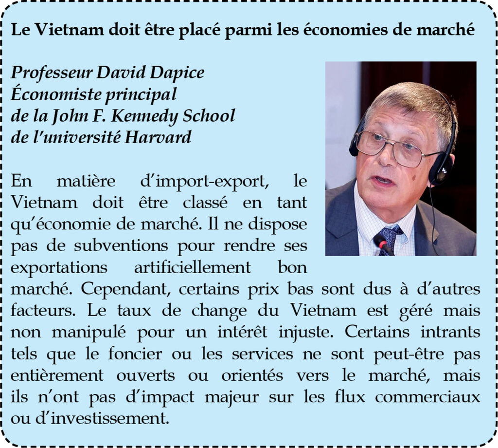“Le Vietnam est déjà une économie de marché”, a déclaré Ted Osius, directeur du Conseil d’affaires États-Unis - ASEAN (USABC), qui soutient la mise à niveau. “Il a rempli des critères clés tels que la convertibilité de la monnaie et est prêt à recevoir une désignation précise”, a estimé l’ancien ambassadeur des États-Unis au Vietnam.
