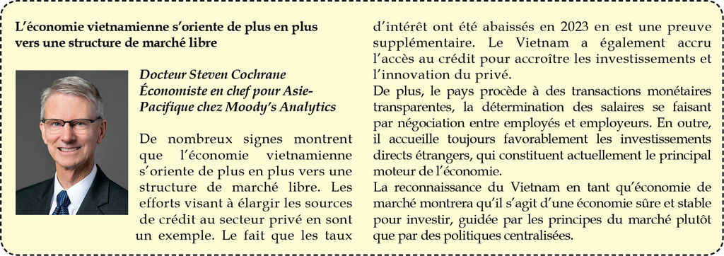 Selon la Déclaration conjointe sur l’élévation de leurs relations au rang de “partenariat stratégique intégral” lors de la visite du président américain Joe Biden à Hanoï en septembre 2023, les États-Unis ont salué les “progrès remarquables” réalisés par le Vietnam pour faire avancer les réformes fondées sur le marché. Ils ont affirmé leur enthousiasme et leur engagement pour un processus de coordination vaste, vigoureux, constructif et dans un esprit de soutien au Vietnam dans sa transition vers une économie de marché, puis vers la reconnaissance de son statut d’économie de marché en vertu de la loi américaine.