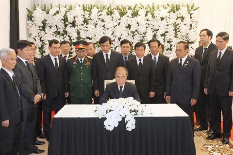 | Le président de l'AN, Nguyên Sinh Hùng, écrit dans le registre de deuil, le 10 juin à Phnom Penh. |