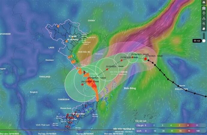 Deux épisodes de pluies sont attendus : du 22 au 24 octobre, les provinces de Quang Tri à Dà Nang pourraient recevoir jusqu’à 600 mm de précipitations, voire 800 mm localement ; du 25 au 27 octobre, de nouvelles pluies intenses sont prévues, principalement à Quang Tri et Huê, avec des cumuls pouvant atteindre 300 à 500 mm.