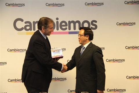| Hoàng Binh Quân (droite) et le président du PRO (Proposition républicaine, conservateur) au pouvoir, Humberto Schiavoni, le 29 juin en Argentine. |