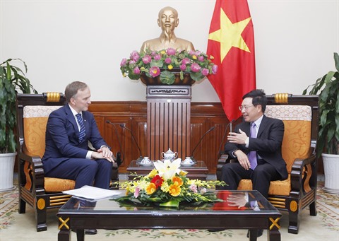 | Le secrétaire d’État letton aux AE, Andreis Pildegovics (gauche), reçu par le vice-Premier ministre et ministre des AE, Pham Binh Minh, le 12 juin à Hanoï. |